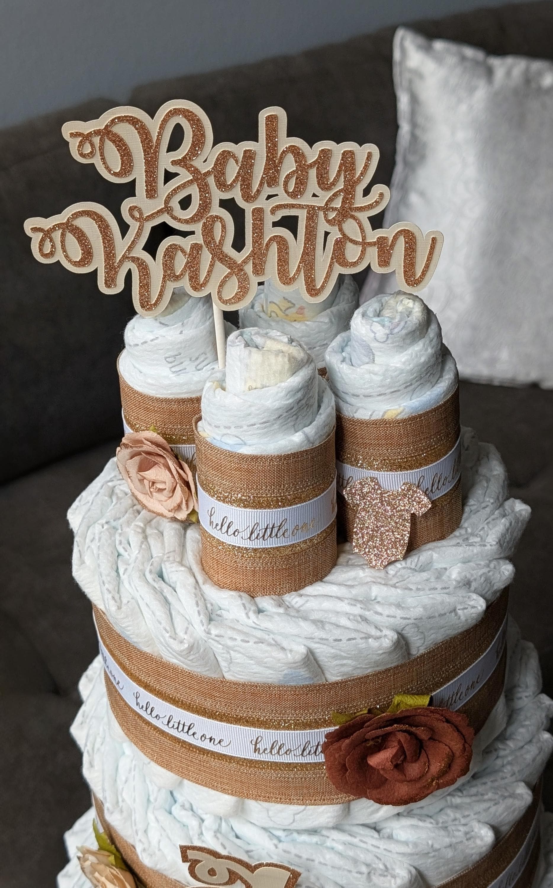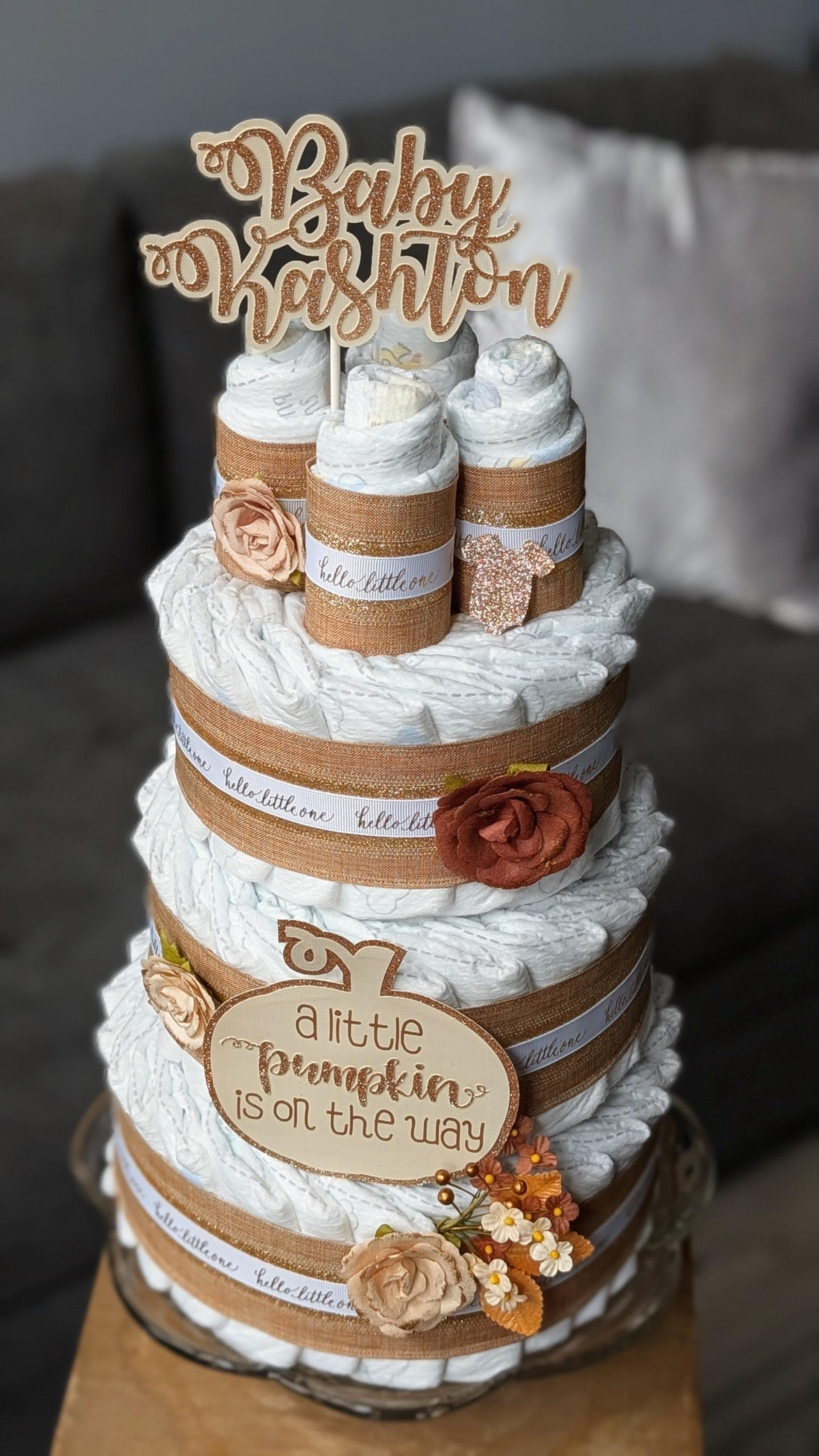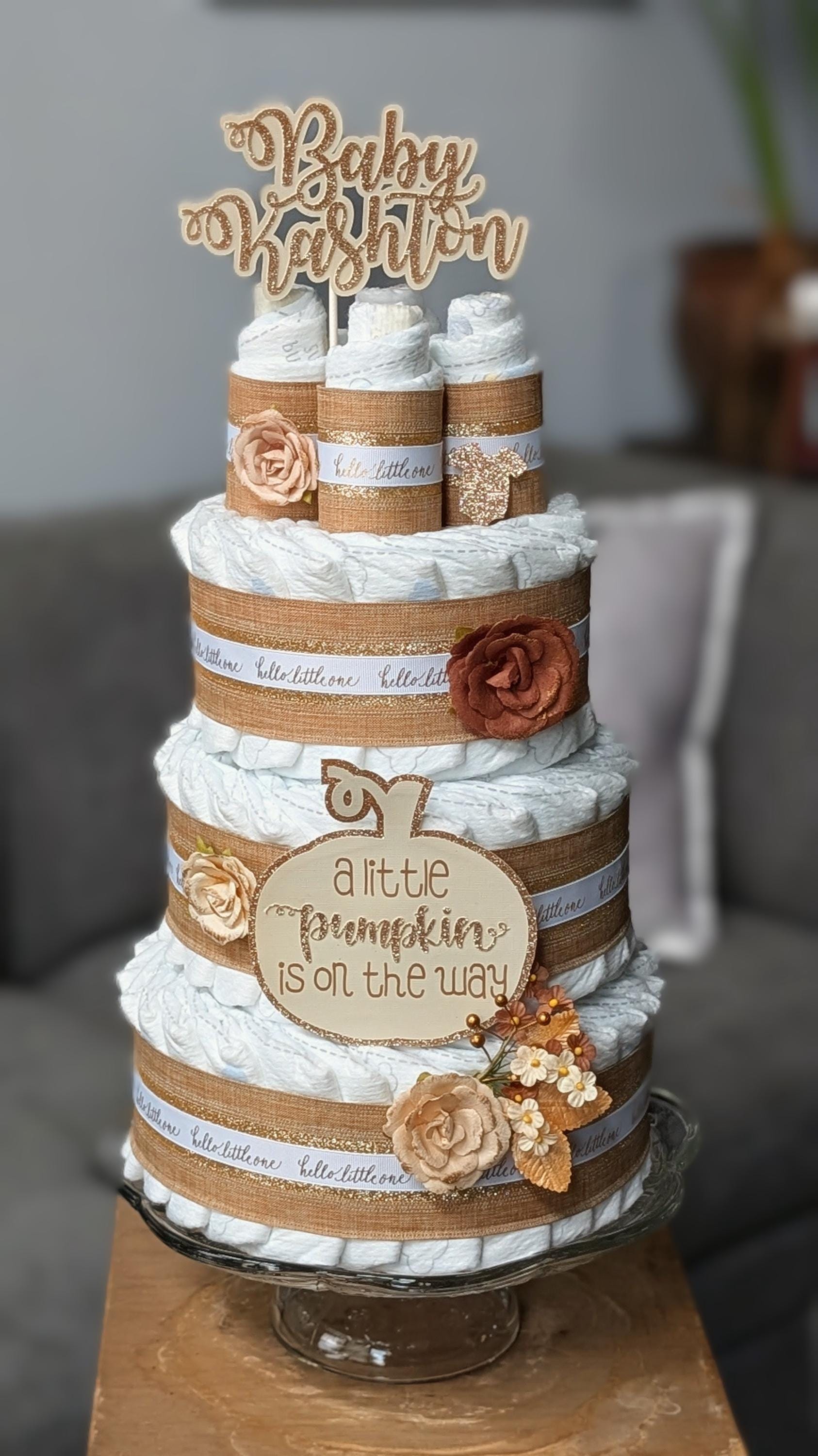 Introducing our fabulous creation—the Pumpkin Diaper Cake, a showstopper that will steal the spotlight at any baby shower or fall celebration! This large 3-tier masterpiece is crafted with approximately 68 Pampers Swaddlers Size 2 diapers and comes adorned with a custom cake topper and a charming cardstock pumpkin decal. Guaranteed to bring smiles to both parents and guests alike. It's not only a practical present but also a stunning centerpiece that adds a touch of whimsy to any celebration. Get ready to impress and delight with this perfect gift that is as useful as it is adorable!